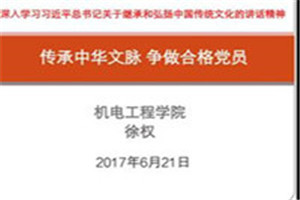 为贯彻落实习近平总书记“两学一做”精神内容,继承和传承中华民族传统美德。太阳成tyc234cc于2017年6月21日14:40综合楼306开展“传承中华文化,争做合格党员”党课教育活动。党课由徐权经理主讲,公司教工党员、员工党员参加。