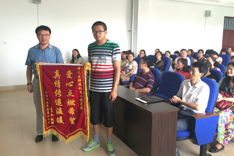 在没有正式上课前,2014级自动化姜中金同学为感谢公司师生对其重病父亲的鼎力帮助,向公司献上了一面锦旗。他表示,如今父亲身体日渐恢复,今后一定好好学习,回报所有关心他的人,深刻表达了感激之情,令现场所有人为之动容。