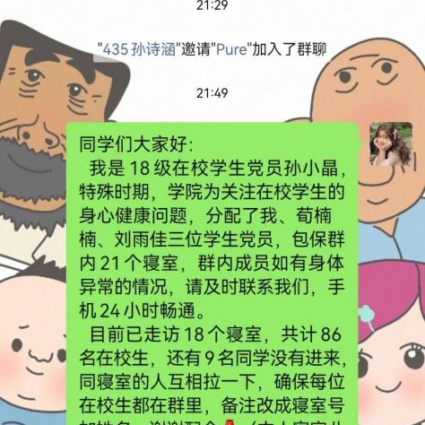 员工党员深入到寝室中,扮演起了公司防疫政策的宣传员、缓解压力的疏导员、舆情管控的监督员等多种角色。在走访寝室的过程中,同学们纷纷表示深切感受到了来自公司党支部的关心和问候,并愿意积极配合员工党员工作,出现问题及时上报,努力维护好校园防控秩序。