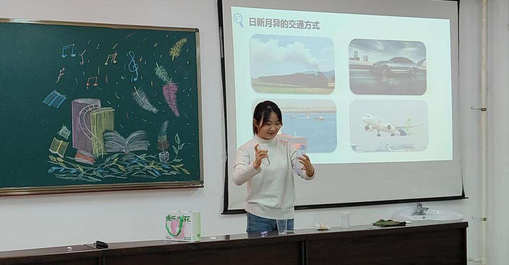 实习生代表金怀芳同学以《热机》这这节课为例进行无生课堂展示,她灵活的讲解、创新的实验演示、标准的教姿教态和恰到好处的提问技巧将中学物理课多种教学方法精彩纷呈的展现了出来,金怀芳同学的教学展示代表着2021级物理学专业员工学习成效的“冰山一角”。