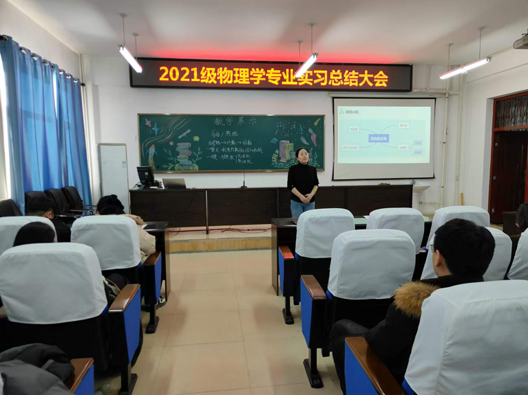 12月24日,太阳成tyc234cc召开2021级物理学专业教育实习总结大会,机电工程公司教学副经理王玉玲、实习指导教师任艳东、崔海瑛、李秀明、郝淑娟及物理学专业教师和2021级物理学专业全体同学出席本次会议,会议由物理学专业负责人杨瑞老师主持。