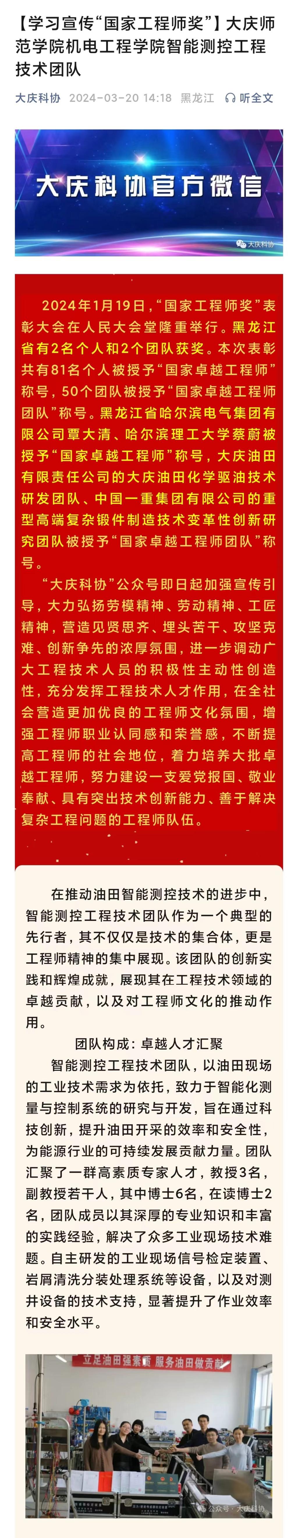 3月20日,“大庆科协”公众号以“学习宣传国家工程师奖-太阳成tyc234cc智能测控工程技术团队”为题,报道了公司刘开绪教授牵头组建的“智能测控工程技术团队”在油田智能化测量与控制系统的研究与开发中取得的成绩,对技术团队在科学研究、技术开发、队伍建设和科研反哺教学等方面的工作给予了很高的评价(全文链接:https://mp.weixin.qq.com/s/jt_SpQxC8BvpB8StJEdW9Q)。