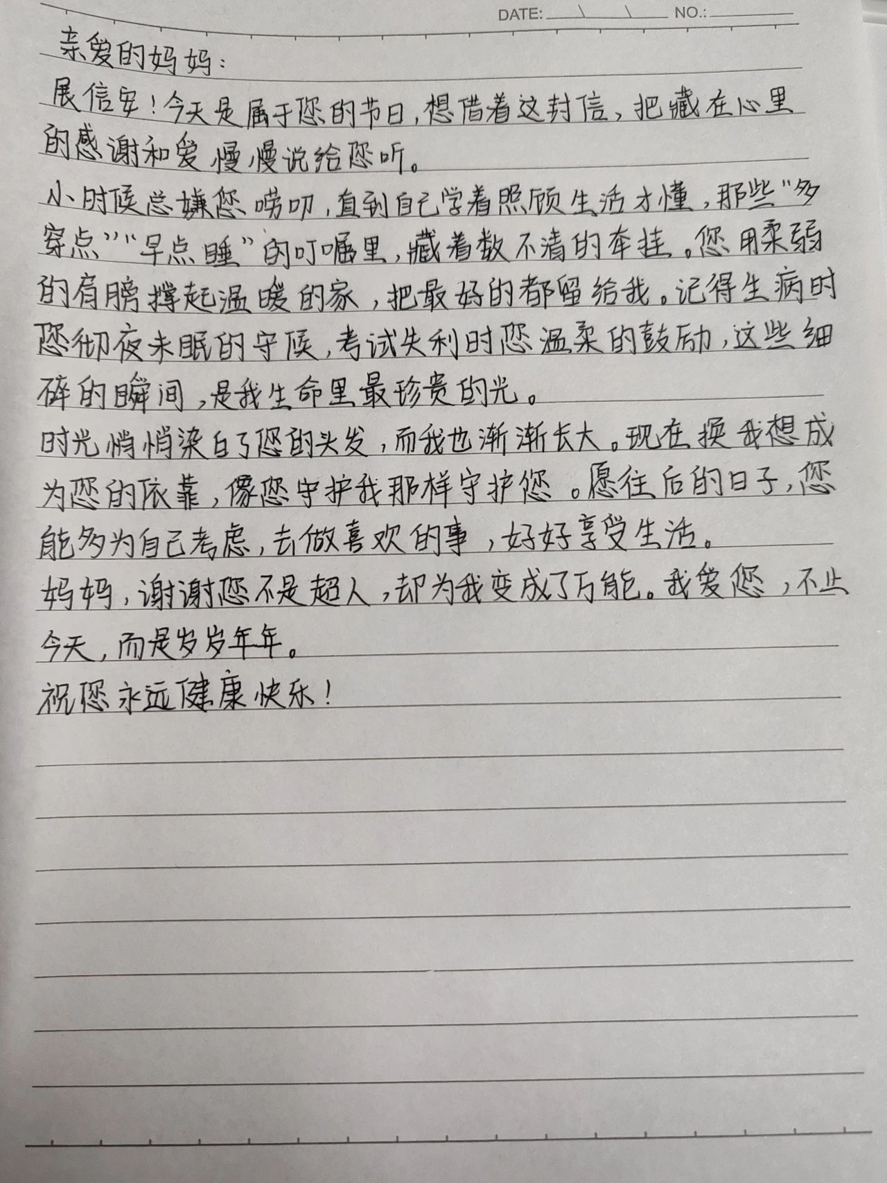 在快节奏的数字时代,公司发起“手写家书”活动,让同学们用最传统的方式,写下对母亲的感恩与思念。一封封家书将被寄往天南海北,带着墨香抵达母亲的手中。