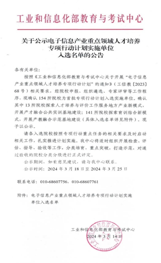 电子信息产业重点领域人才培养专项行动计划旨在推动电子信息产业重点领域高素质技术技能人才队伍建设,由工业和信息化部教育与考试中心征集专项行动实施单位。此次成功入选,不仅有利于创新优化电子信息产业重点领域人才培养路径,也将进一步促进未来公司高水平学科专业集群建设。